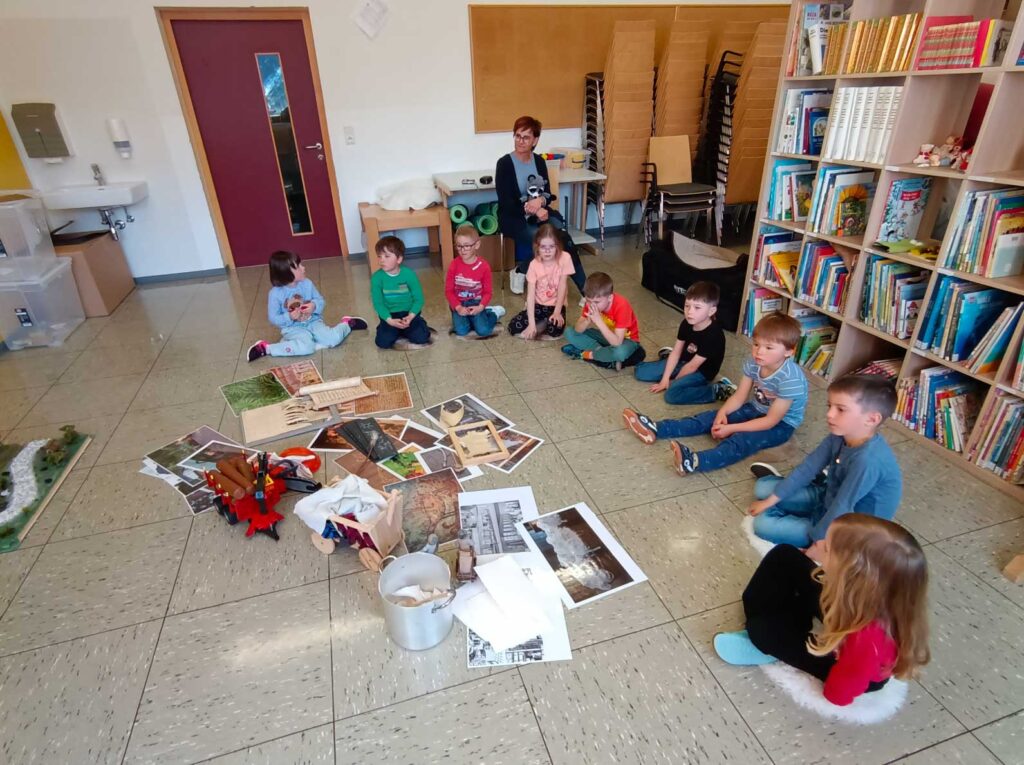 Ausgehend von einer Zeitung aus Wastls Rucksack lernten die Kinder, wie Menschen heute Informationen erhalten. Erika erklärte daraufhin anschaulich, dass dies früher ganz anders war. Gemeinsam wurde erkundet, wie Menschen in der Steinzeit ihre Geschichten auf Höhlenwände malten und später im alten Ägypten Papyrus als Schreibmaterial nutzten.